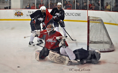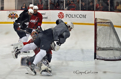 Even though I've written a few posts for the Scarlet Caps, this is done as a favor to the people who run the site and my own desire to educate their readers about the team and hockey in general. It does not include any perks other than occasionally getting free admission to an event to cover it for their blog. It also does not qualify me for accredtation with the team (at least I don't think it does). All photographs taken during Caps practice are done from the public viewing areas of Kettler. (I do sometimes wish I could get over to the press area for a few, but again, I have never asked for this and probably never will.)